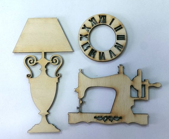 Материал: фанера 4 мм Размер: лампа 11,5*6 см, часы D-6 см, швейная машинка 9*6 см